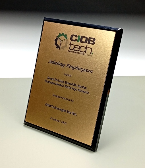 Solid black acrylic plaque with gold certificate. Can fit 8R size paper. Printing in gold or silver film with gloss lamination
