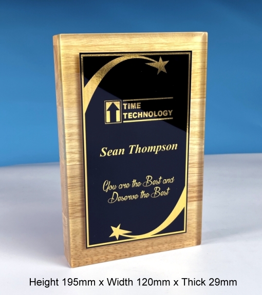 This design is made of solid wood with gold printing embedded in between wood and acrylic